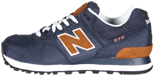 Pieced navy canvas upper. Low profile athletic shoe, white lace front. Brown New Balanca logo on side. Padded collar. Padded insole. Man made rubber textured outsole. Size 10 shown.