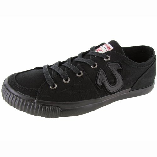 True Religion Men's Hanabel Court Low Sneaker Shoes. These sneakers feature a cavnas upper, a lace up style, a rubber sole, and True Religion's signature horseshoe patch on the side.